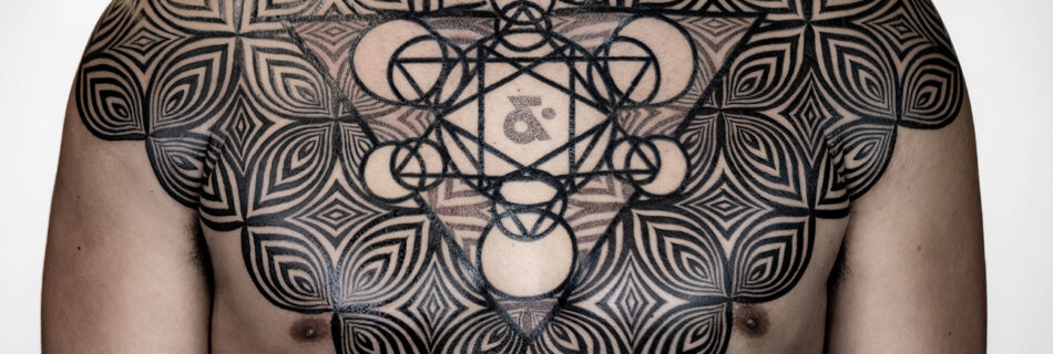 METATRON’S CHESTPIECE Anchored by Metatron’s Cube at the center of the chest, this design expands into a bold, symmetrical geometric pattern extending from shoulder to shoulder. The challenge and artistry lie in seamlessly integrating these elements at the center, creating a balanced and cohesive flow that enhances both structure and visual impact. BACK TO ARTWORK