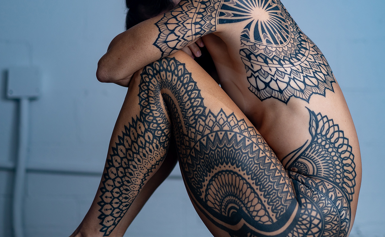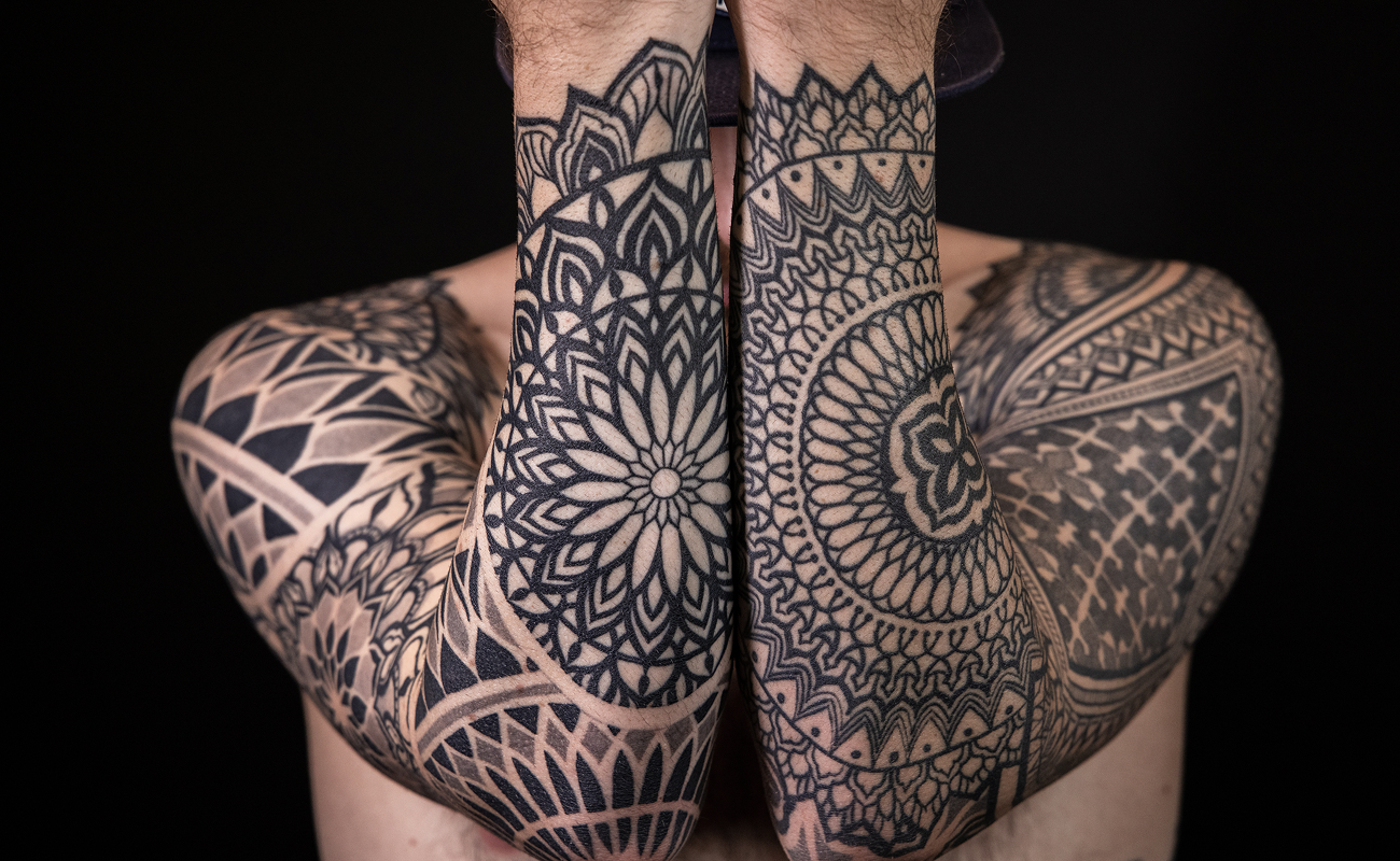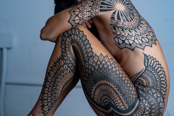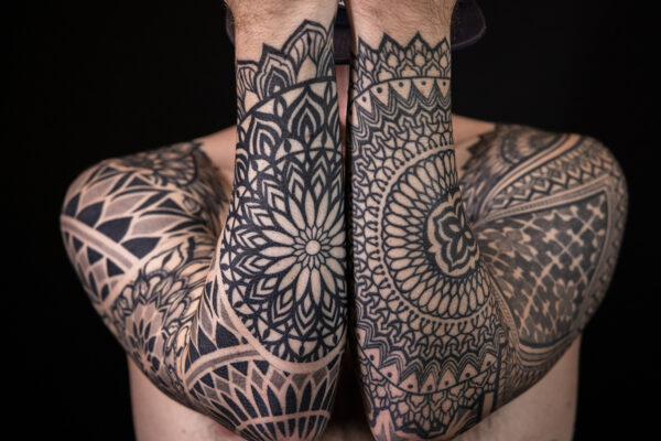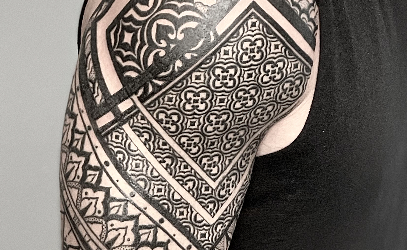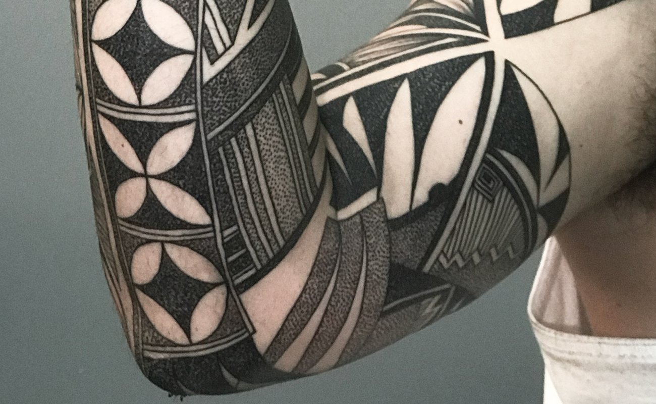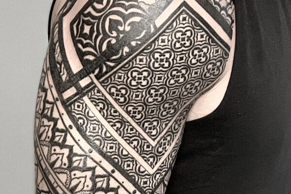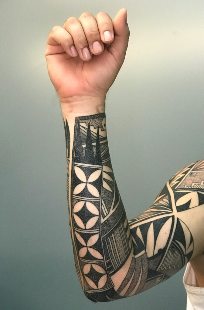Inspired by the intricate Navajo and Native American patterns observed while growing up in northern New Mexico, this sleeve seamlessly integrates traditional motifs with the natural contours of the arm. The design pays homage to cultural artistry while complementing the muscle structure, resulting in a cohesive and dynamic composition.